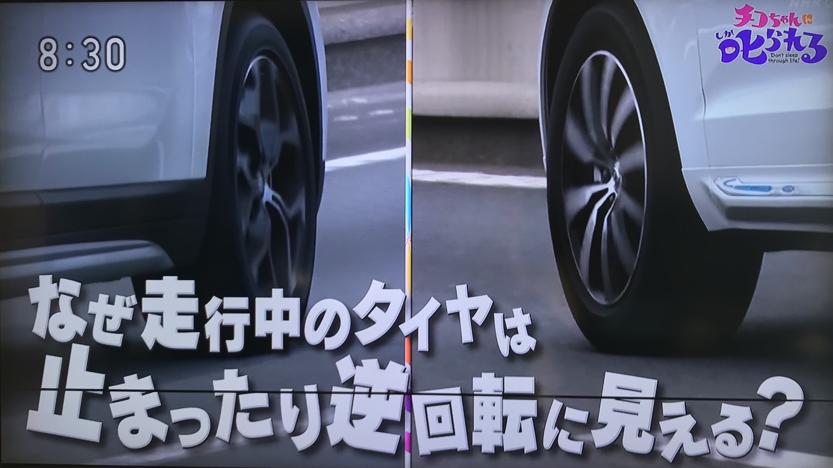 HOME >なんで走行中のタイヤは止まったり逆回転に見えるの?→人間は1秒間に4~5枚の絵しか見ていないから。見えていない瞬間に一回りすれば止まって見える。 投稿日:2020年12月6日 Twitter シェア Google+ Pocket B!はてブ LINE -