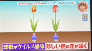 チューリップはアブラムシが運んでくるウイルスに球根が感染すると翌年、その球根から珍しい柄の花が咲くという特徴があります。