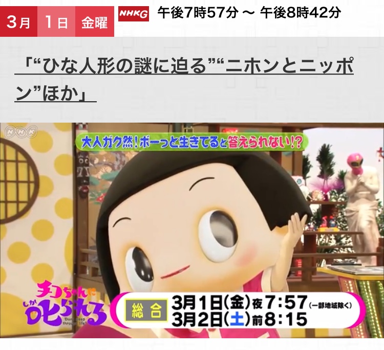 HOME >事前告知チコちゃんに叱られる!「“ひな人形の謎に迫る”“ニホンとニッポン”ほか」2019年3月1日(金)NHK総合 午後7時57分から (再放送翌土曜午前8時15分から) 投稿日:2019年2月27日 Twitter シェア Google+ Pocket B!はてブ LINE -