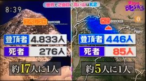 登頂者に対する亡くなった人の割合を比較するとエベレストが約17人に1人という割合に対してK2は約5人に1人と約3倍。