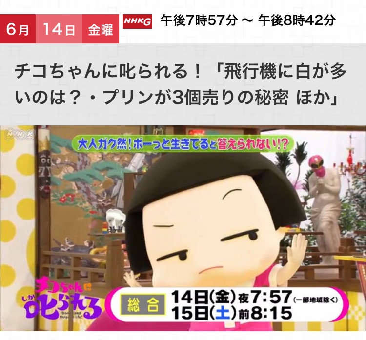 チコちゃんに叱られる!「飛行機に白が多いのは?・プリンが3個売りの秘密 ほか」