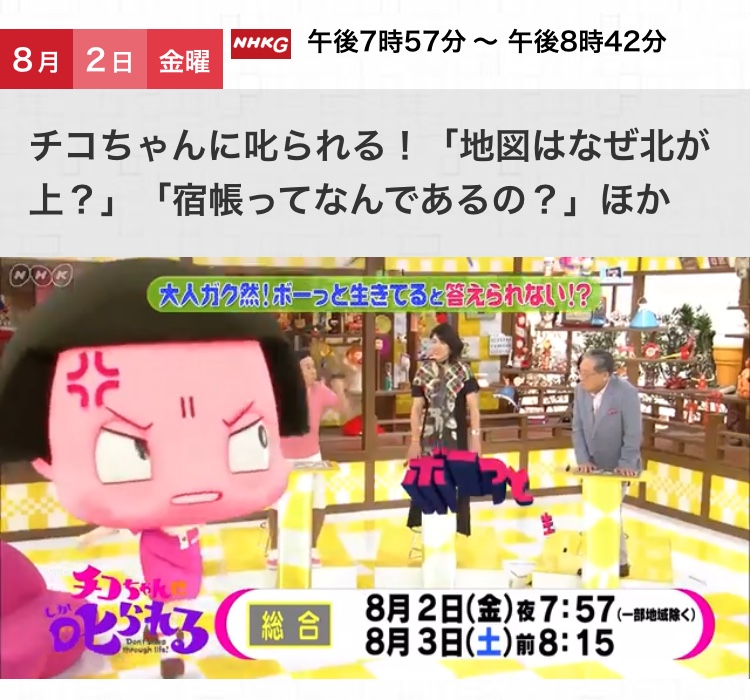 HOME >事前告知チコちゃんに叱られる!「地図はなぜ北が上?」「宿帳ってなんであるの?」ほか 2019年8月2日(金)NHK総合 午後7時57分から (再放送翌土曜午前8時15分から) 投稿日:2019年7月31日 Twitter シェア Google+ Pocket B!はてブ LINE -