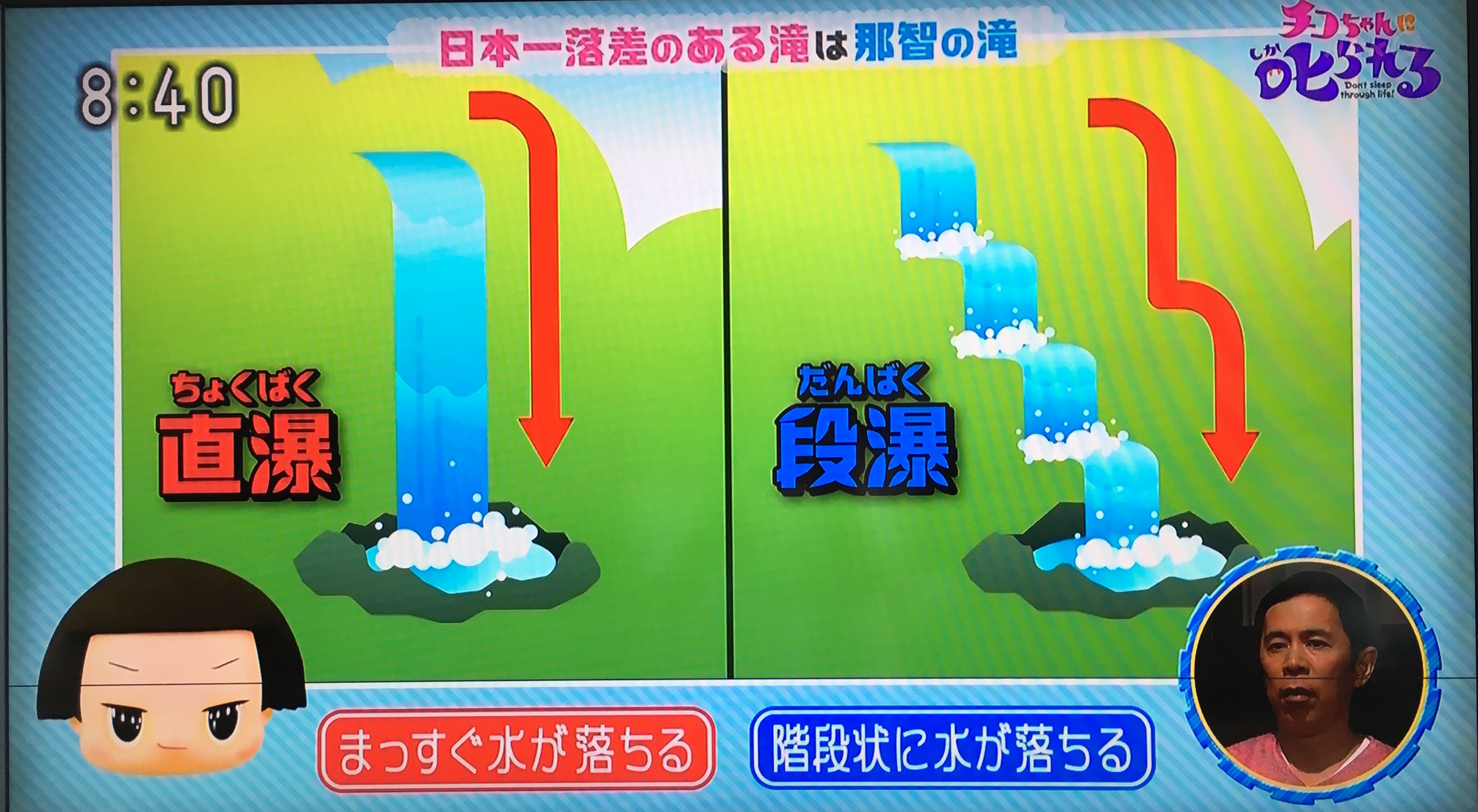 日本一短い川、日本一落差のある滝は?→ぶつぶつ川、直瀑那智滝、段瀑称名滝、季節限定ハンノキ滝