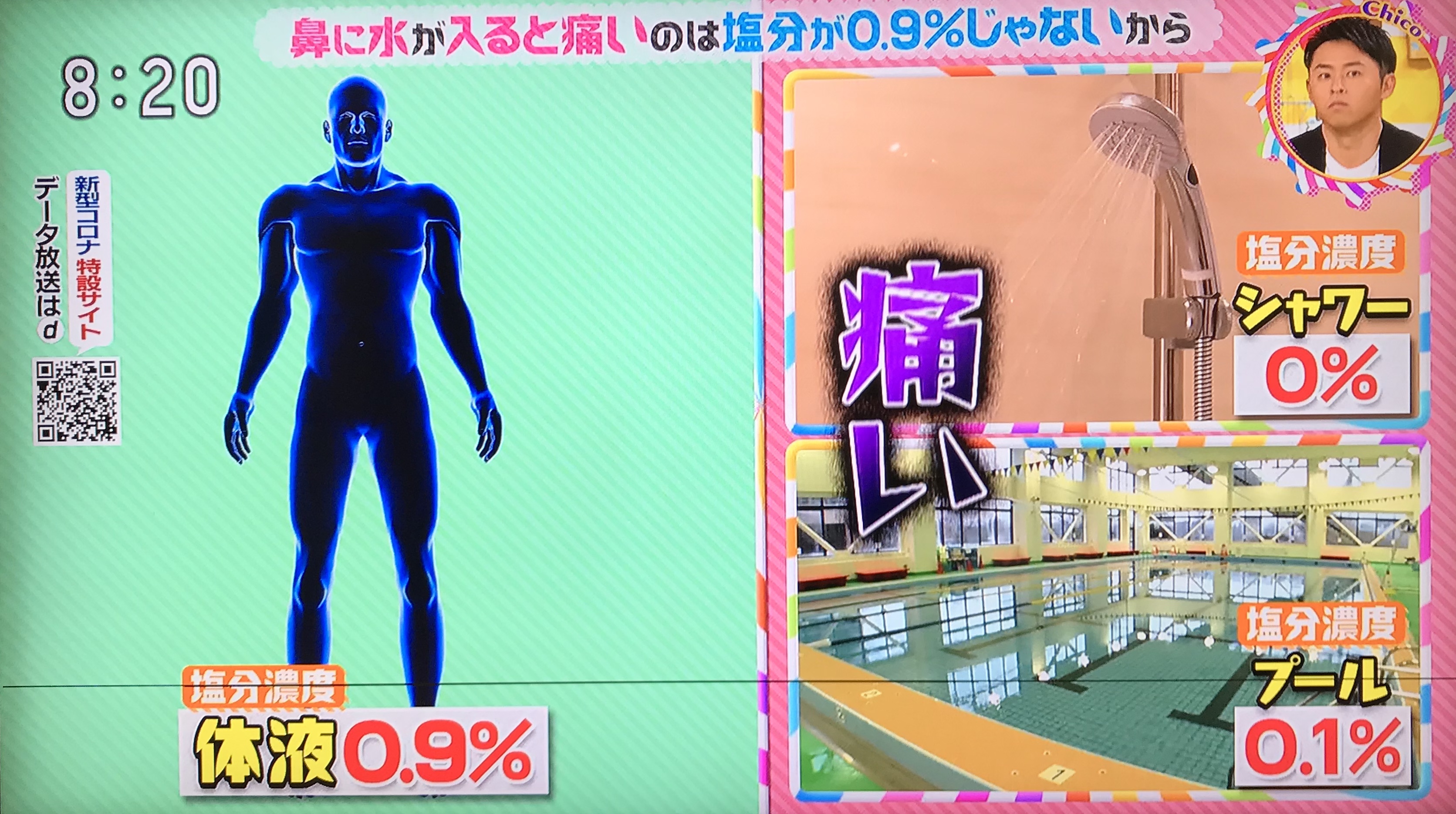 なんで鼻に水が入ると痛いの?→塩分が0.9%じゃないから。収縮膨張した神経細胞膜の半透膜感覚センサーTRPA1が痛みを伝達。