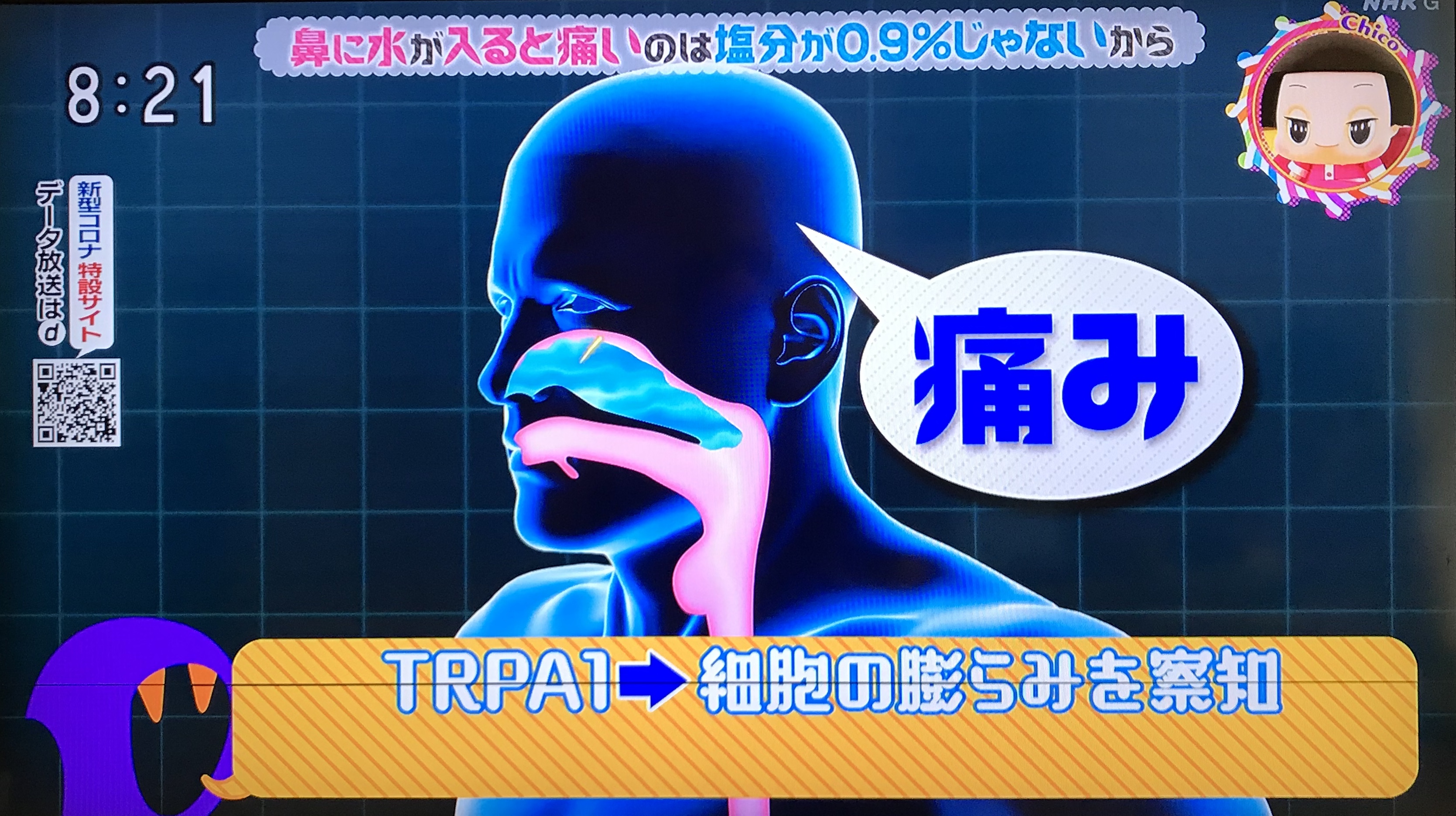 HOME >なんで鼻に水が入ると痛いの?→塩分が0.9%じゃないから。収縮膨張した神経細胞膜の半透膜感覚センサーTRPA1が痛みを伝達。 投稿日:2020年4月5日 Twitter シェア Google+ Pocket B!はてブ LINE -
