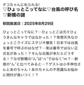「チコちゃんに叱られる!」は、2025年8月29日金曜日、NHK総合 午後7時45分~