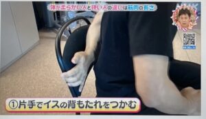 片手で椅子の背もたれを掴み、姿勢を安定させます。